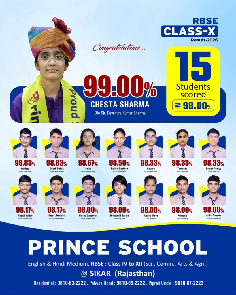 In the recently declared RBSE Class 12 results for 2026, Prince has once again demonstrated his success by delivering a spectacular performance. In the Prince School Sikar 12th Result 2026, five students have achieved an impressive 99.20%: one from the arts stream and four from the science stream.