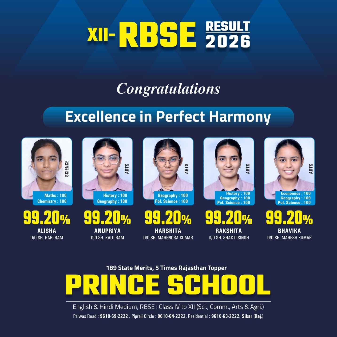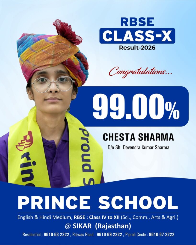 Prince School Sikar 12th Result 2026: 5 Students Scored 99.20%