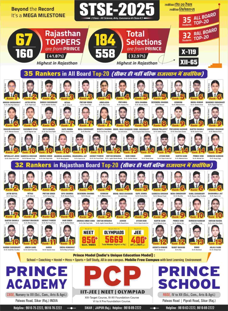 Presenting the best STSE result in Rajasthan, Prince School and Prince Academy gave a total of 184 selections in STSE 2025. This is the highest number of selections in the STSE result 2025 in Rajasthan.