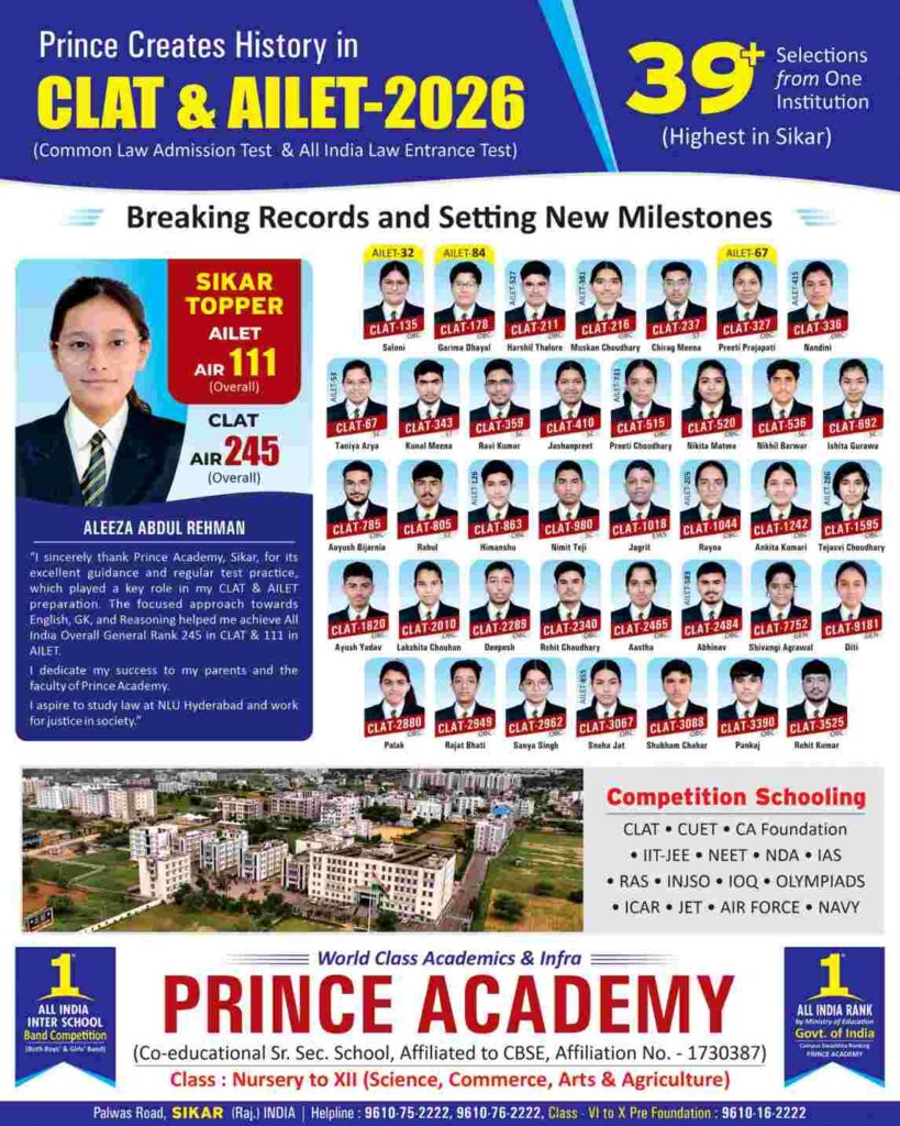 Late evening on 16th December 2025, the result of the Common Law Admission Test (CLAT) 2026 was declared. As soon as the results were announced, Prince Academy, Sikar, once again proved its excellence. This year too, Prince Academy has demonstrated that with the right guidance and well-planned preparation, big goals can be achieved by securing the highest number of selections and the best CLAT result in Sikar.